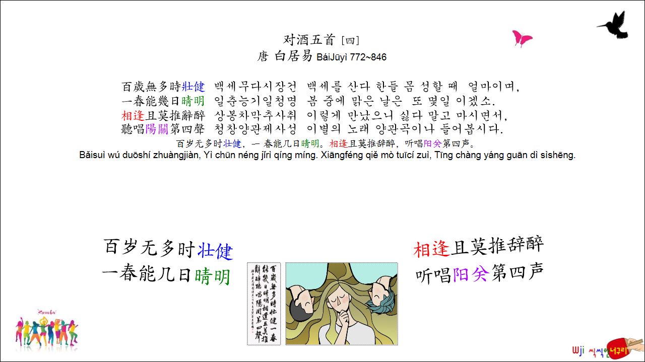 对酒五首 [四] // 百岁无多时壮健,一 春能几日晴明。相逢且莫推辞醉,听唱阳关第四声。中國詩 병음 표기 2025. 7. 7. 20:23
