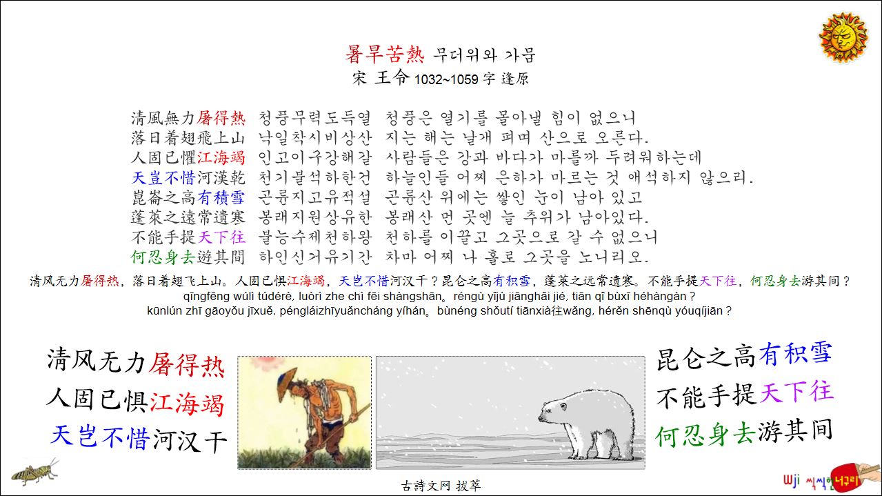 暑旱苦熱 무더위와 가뭄 // 清风无力屠得热,落日着翅飞上山。人固已惧江海竭,天岂不惜河汉干?昆仑之高有积雪,蓬莱之远常遗寒。不能手提天下往,何忍身去游其间?中國詩 병음 표기 2025. 7. 12. 21:25
