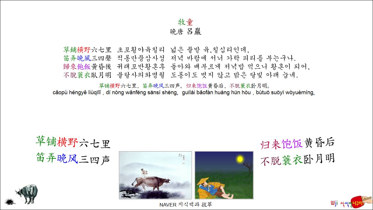 牧童 // 草铺横野六七里,笛弄晚风三四声。归来饱饭黄昏后,不脱蓑衣卧月明。中國詩 병음 표기 2025. 7. 12. 21:29
