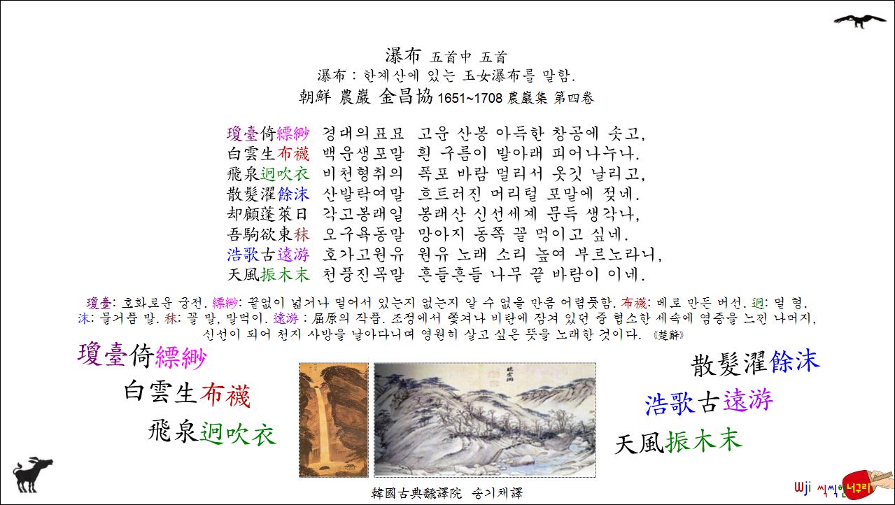 고운 산봉 아득한 창공에 솟고, 흰 구름이 발아래 피어나누나. 폭포 바람 멀리서 옷깃 날리고, 흐트러진 머리털 포말에 젖네. 봉래산 신선세계 문득 생각나, 망아지 동쪽 꼴 먹이고 싶네. 원유 노래 소리 높여 부르노라니, 흔들흔들 나무 끝 바람이 이네.