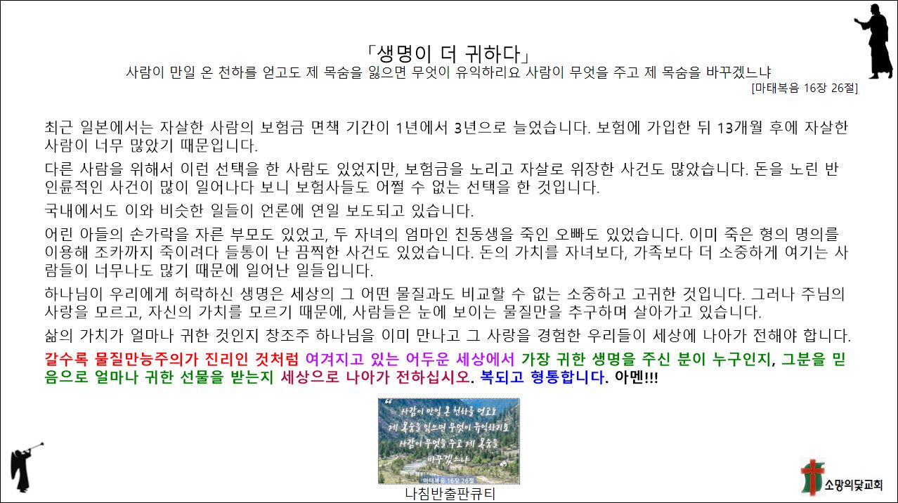 「생명이 더 귀하다」[마태복음 16장 26절] 사람이 만일 온 천하를 얻고도 제 목숨을 잃으면 무엇이 유익하리요 사람이 무엇을 주고 제 목숨을 바꾸겠느냐 //갈수록 물질만능주의가 진리인 것처럼 여겨지고 있는 어두운 세상에서 가장 귀한 생명을 주신 분이 누구인지, 그분을 믿음으로 얼마나 귀한 선물을 받는지 세상으로 나아가 전하십시오. 복되고 형통합니다. 아멘!!!나침반출판큐티 2025. 8. 22. 17:24