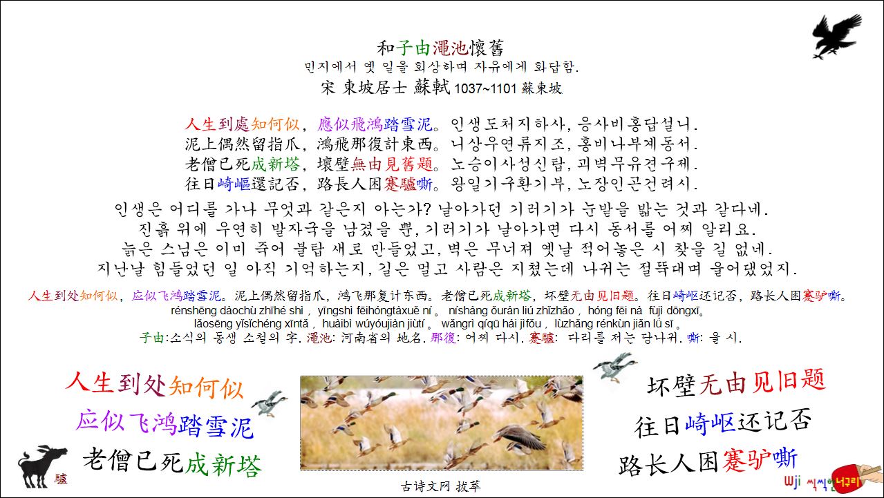 인생은 어디를 가나 무엇과 같은지 아는가? 날아가던 기러기가 눈밭을 밟는 것과 같다네.진흙 위에 우연히 발자국을 남겼을 뿐, 기러기가 날아가면 다시 동서를 어찌 알리요.늙은 스님은 이미 죽어 불탑 새로 만들었고, 벽은 무너져 옛날 적어놓은 시 찾을 길 없네.지난날 힘들었던 일 아직 기억하는지, 길은 멀고 사람은 지쳤는데 나귀는 절뚝대며 울어댔었지.