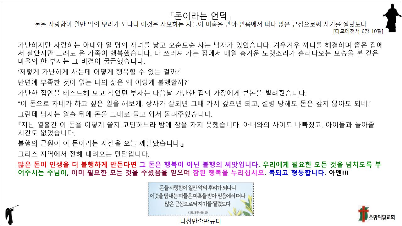 「돈이라는 언덕」[디모데전서 6장 10절] 돈을 사랑함이 일만 악의 뿌리가 되나니 이것을 사모하는 자들이 미혹을 받아 믿음에서 떠나 많은 근심으로써 자기를 찔렀도다 //많은 돈이 인생을 더 불행하게 만든다면 그 돈은 행복이 아닌 불행의 씨앗입니다. 우리에게 필요한 모든 것을 넘치도록 부어주시는 주님이, 이미 필요한 모든 것을 주셨음을 믿으며 참된 행복을 누리십시오. 복되고 형통합니다. 아멘!!!나침반출판큐티 2025. 9. 30. 22:18
