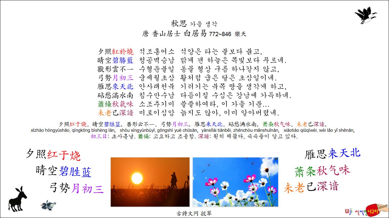 석양은 타는 불보다 붉고, 맑게 갠 하늘은 쪽빛보다 푸르네. 동물 형상 구름 하나같지 않고, 활처럼 굽은 달은 초삼일이네. 기러기는 북쪽 땅을 생각게 하고, 다듬이질 수심은 강남에 가득하네. 쓸쓸하여라, 이 가을 기분... 늙지도 않아, 이미 알아버렸네.