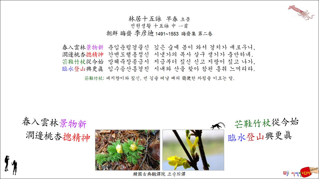 林居十五詠 早春 초봄전원생활 十五詠 中 一首 // 春入雲林景物新,澗邊桃杏摠精神。芒鞋竹杖從今始,臨水登山興更眞。봄 春 2025. 10. 11. 09:28