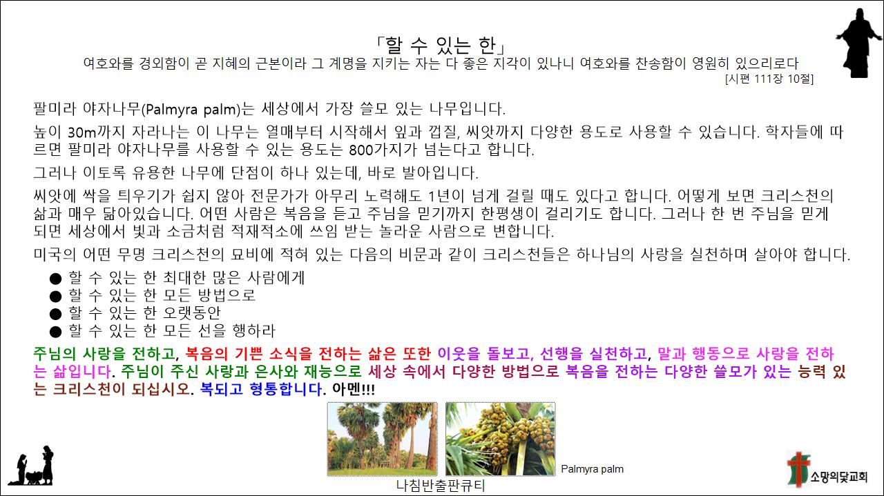 「할 수 있는 한」[시편 111장 10절]여호와를 경외함이 곧 지혜의 근본이라 그 계명을 지키는 자는 다 좋은 지각이 있나니 여호와를 찬송함이 영원히 있으리로다 //주님의 사랑을 전하고, 복음의 기쁜 소식을 전하는 삶은 또한 이웃을 돌보고, 선행을 실천하고, 말과 행동으로 사랑을 전하는 삶입니다. 주님이 주신 사랑과 은사와 재능으로 세상 속에서 다양한 방법으로 복음을 전하는 다양한 쓸모가 있는 능력 있는 크리스천이 되십시오. 복되고 형통합니다. 아멘!!나침반출판큐티 2025. 10. 15. 19:15