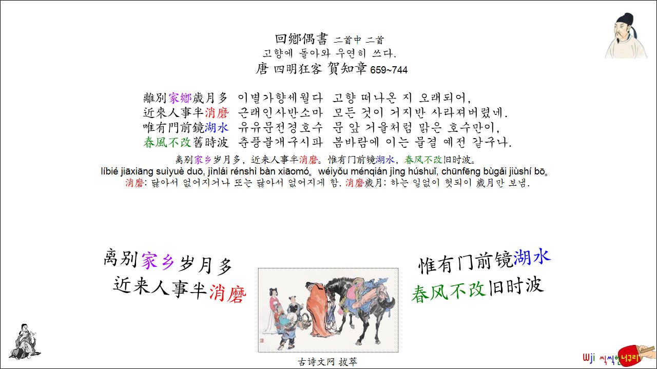 回鄕偶書 二首中 二首 고향에 돌아와 우연히 쓰다. // 离别家乡岁月多,近来人事半消磨。惟有门前镜湖水,春风不改旧时波。中國詩 병음 표기 2025. 12. 6. 21:13