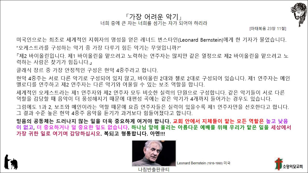 「가장 어려운 악기」[마태복음 23장 11절]너희 중에 큰 자는 너희를 섬기는 자가 되어야 하리라 //믿음의 공동체는 드러나지 않는 일을 더욱 중요하게 여겨야 합니다. 교회 안에서 지체들이 맡는 모든 역할은 높고 낮음이 없고, 더 중요하거나 덜 중요한 일도 없습니다. 하나님 앞에 올리는 아름다운 예배를 위해 우리가 맡은 일을 세상에서 가장 귀한 일로 여기며 감당하십시오. 복되고 형통합니다. 아멘!!!나침반출판큐티 2025. 12. 21. 15:33