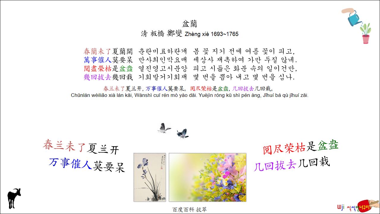 盆蘭 // 春兰未了夏兰开, 万事催人莫要呆。阅尽荣枯是盆盎, 几回拔去几回栽。中國詩 병음 표기 2026. 1. 19. 19:08