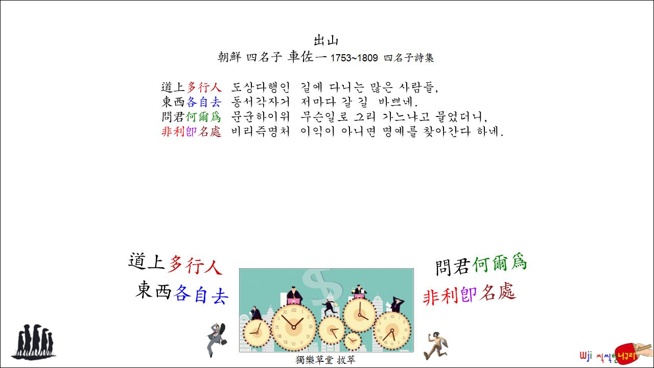 길에 다니는 많은 사람들, 저마다 갈 길 바쁘네. 무슨일로 그리 가느냐고 물었더니, 이익이 아니면 명예를 찾아간다 하네.