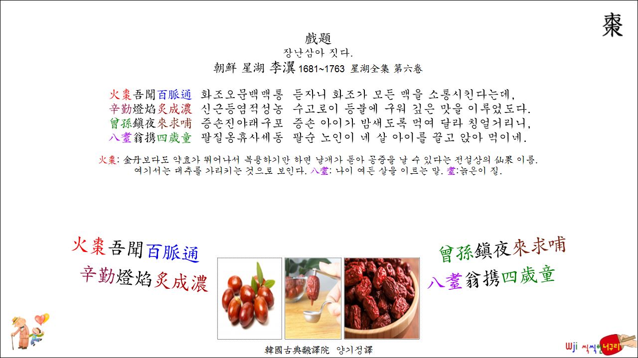 戲題 장난삼아 짓다. // 火棗吾聞百脈通, 辛勤燈焰炙成濃. 曾孫鎭夜來求哺, 八耋翁携四歲童.한시조 2026. 2. 28. 09:13