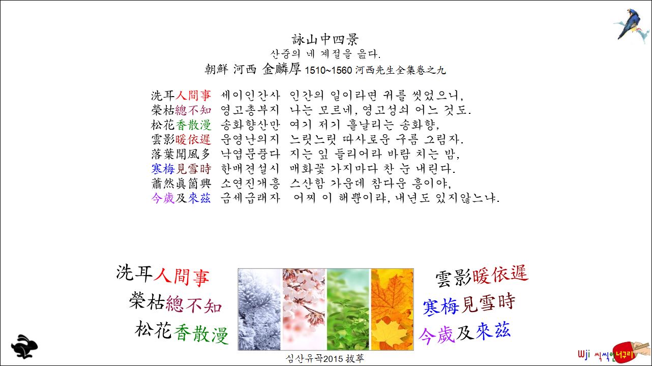 詠山中四景 산중의 네 계절을 읊다. // 洗耳人間事, 榮枯總不知. 松花香散漫, 雲影暖依遲. 落葉聞風多, 寒梅見雪時. 蕭然眞箇興, 今歲及來玆.한시조 2026. 3. 1. 08:49