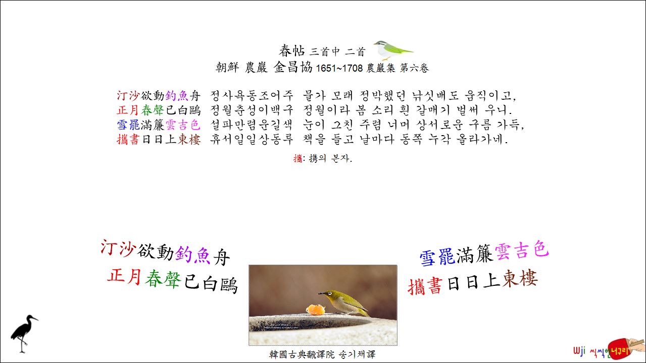 春帖 三首中 二首 // 汀沙欲動釣魚舟。正月春聲已白鷗。雪罷滿簾雲吉色。携書日日上東樓。봄 春 2026. 3. 6. 17:52