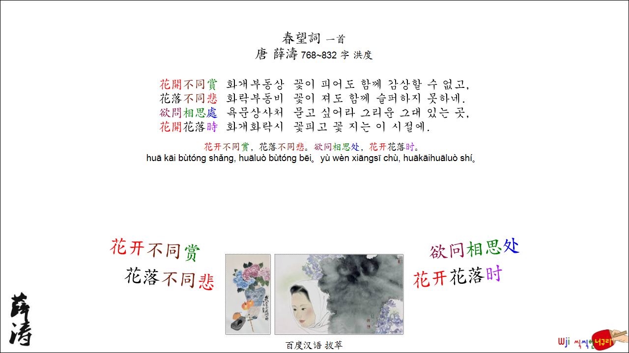 春望詞 一首 // 花开不同赏,花落不同悲。欲问相思处,花开花落时。中國詩 병음 표기 2026. 3. 7. 09:54