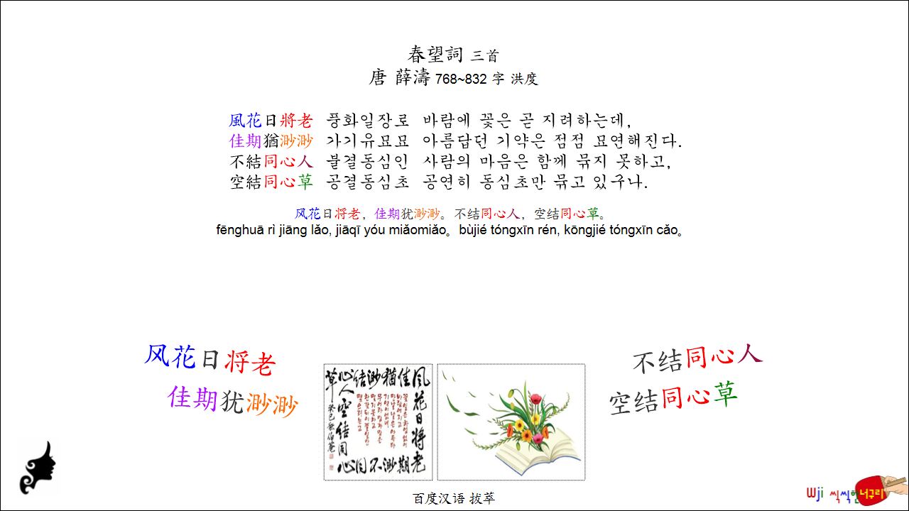 春望詞 三首 // 风花日将老,佳期犹渺渺。不结同心人,空结同心草。中國詩 병음 표기 2026. 3. 7. 09:59
