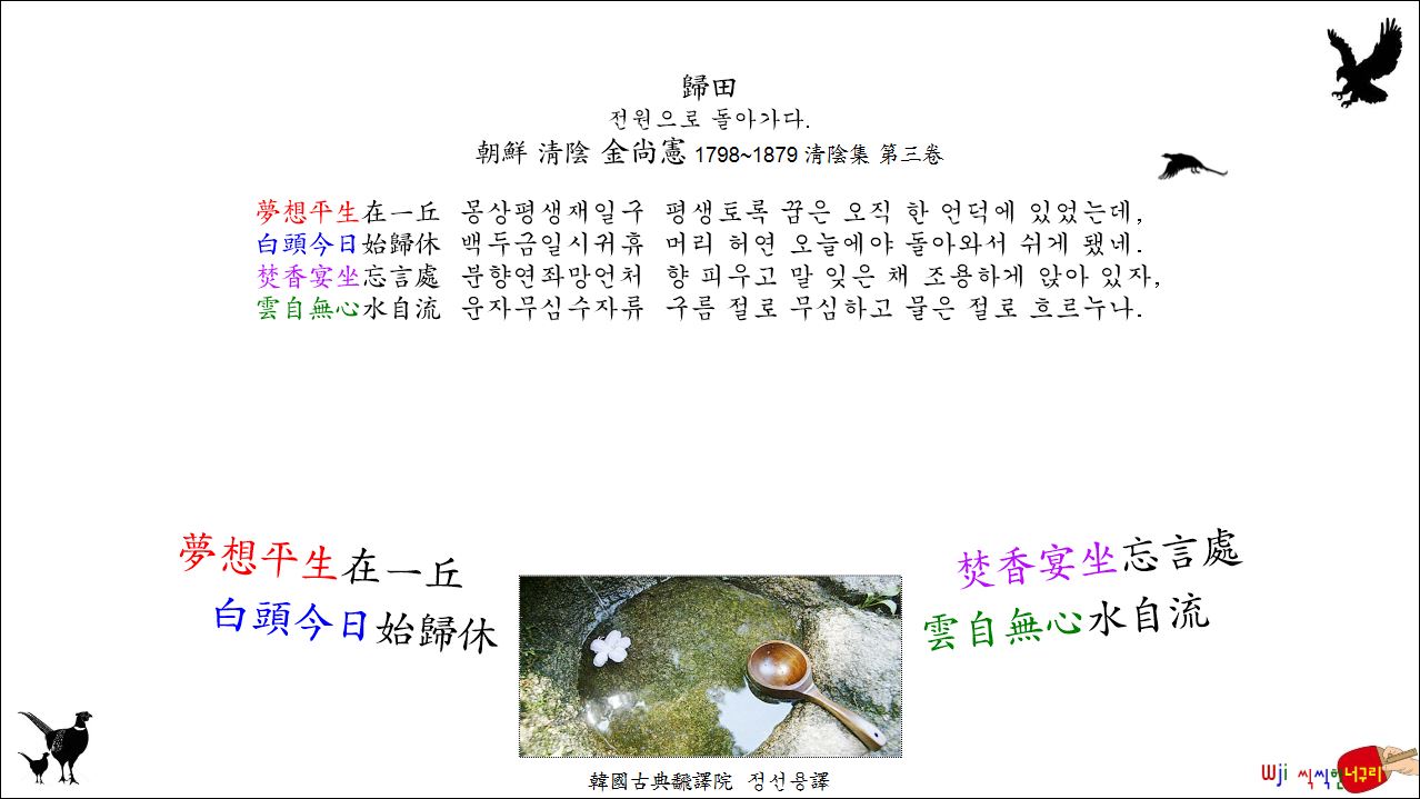 歸田 전원으로 돌아가다. // 夢想平生在一丘。白頭今日始歸休。焚香宴坐忘言處。雲自無心水自流。한시조 2026. 3. 12. 19:33