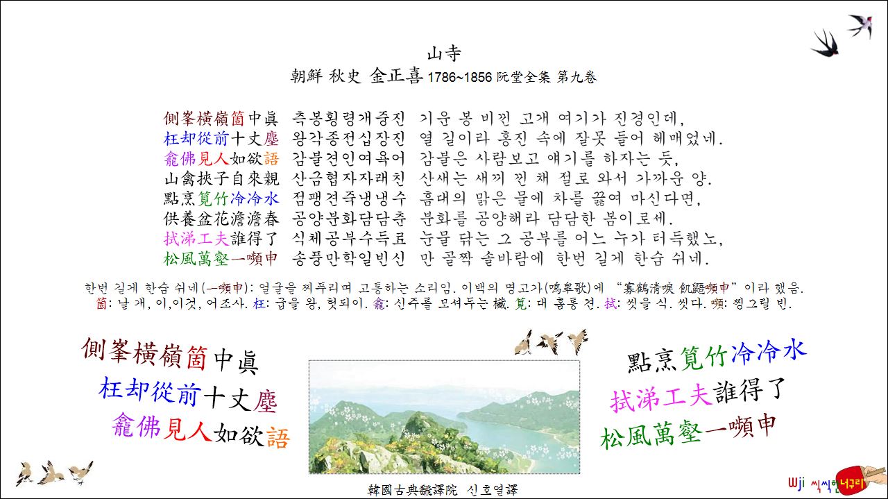 山寺 // 側峰橫嶺箇中眞。枉却從前十丈塵。龕佛見人如欲語。山禽挾子自來親。點烹筧竹冷冷水。供養盆花澹澹春。拭涕工夫誰得了。松風萬壑一嚬申。봄 春 2026. 3. 16. 18:57