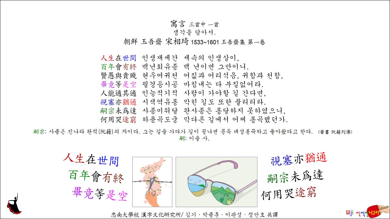 寓言 三首中 一首 생각을 담아서. // 人生在世間,百年會有終。賢愚與貴賤,畢竟等是空。人能適其適,視塞亦猶通。嗣宗未爲達,何用哭途窮?한시조 2026. 3. 17. 17:43