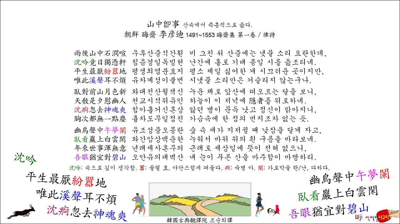 山中卽事 산속에서 즉흥적으로 읊다. // 雨後山中石澗喧,沈吟竟日獨憑軒。平生最厭紛囂地,唯此溪聲耳不煩。臥對前山月色新,天敎是夕慰幽人。沈痾忽去神魂爽,胸次都無一點塵。幽鳥聲中午夢闌,臥看巖上白雲閑。年來世事渾無意,吾眼猶宜對碧山。한시조 2026. 3. 18. 17:51