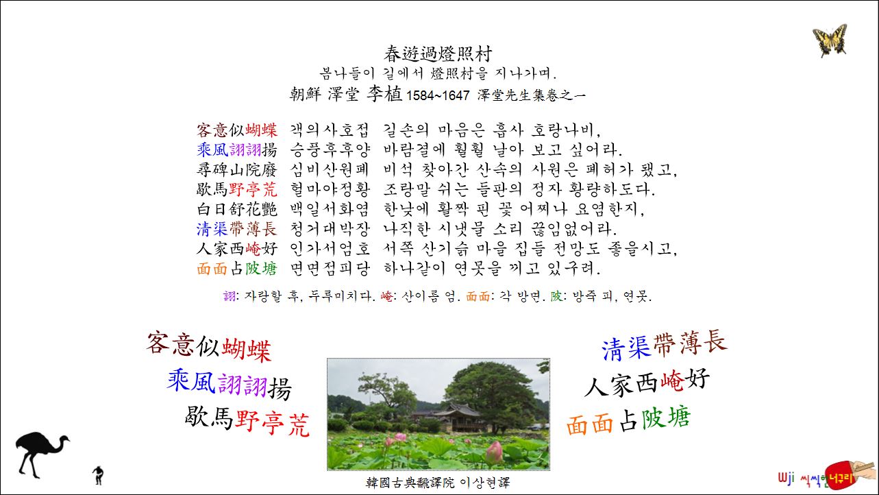 春遊過燈照村 봄나들이 길에서 燈照村을 지나가며. // 客意似蝴蝶。乘風詡詡揚。尋碑山院廢。歇馬野亭荒。白日舒花艶。淸渠滯薄長。人家西崦好。面面占陂塘。봄 春 2026. 3. 25. 18:30