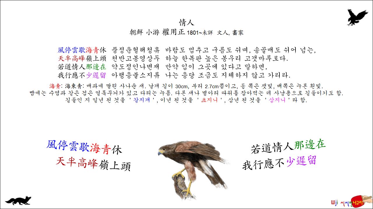 情人 // 風停雲歇海靑休, 天半高峰嶺上頭. 若道情人那邊在, 我行應不少遲留.한시조 2026. 3. 26. 17:23