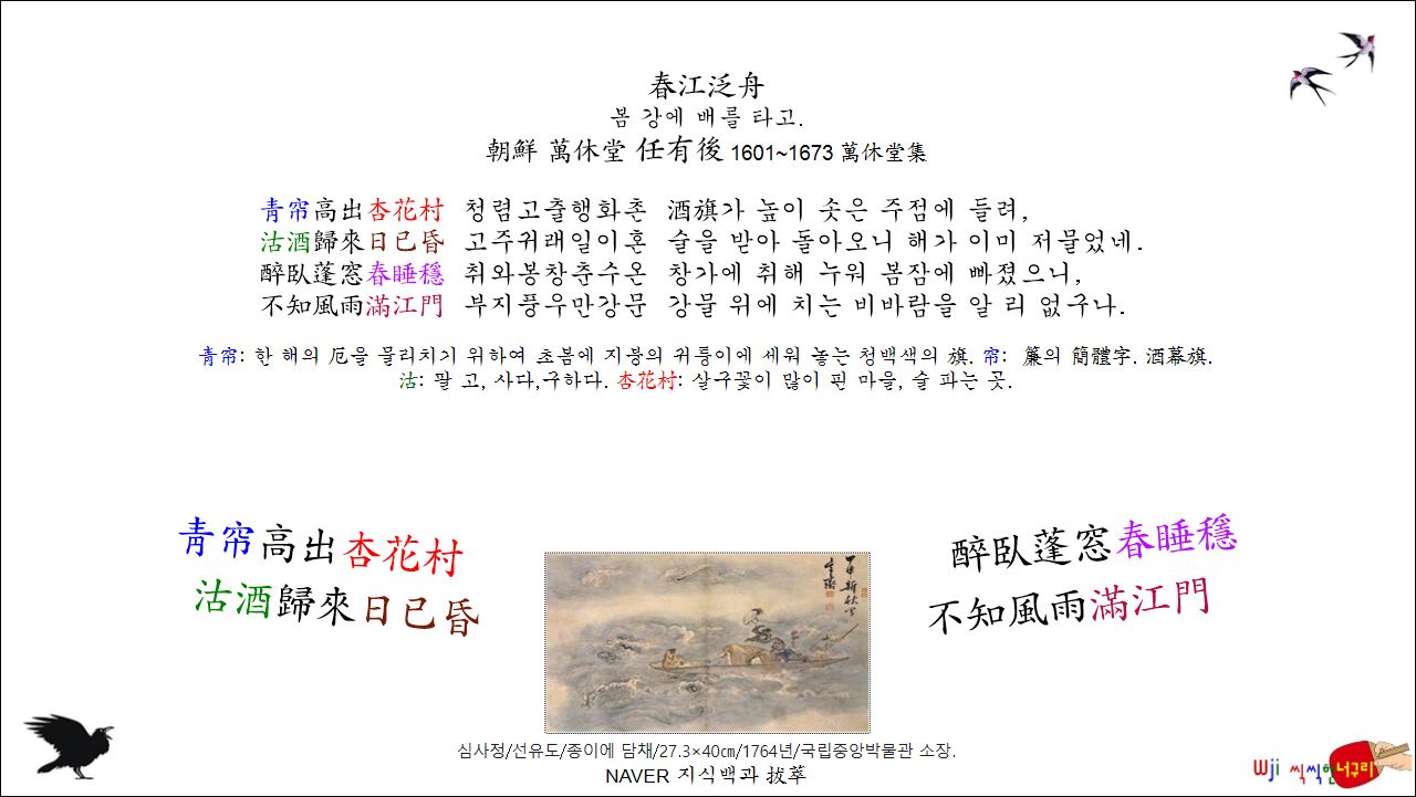 春江泛舟 봄 강에 배를 타고. // 靑帘高出杏花村, 沽酒歸來日已昏. 醉臥蓬窓春睡穩, 不知風雨滿江門.봄 春 2026. 3. 28. 08:39