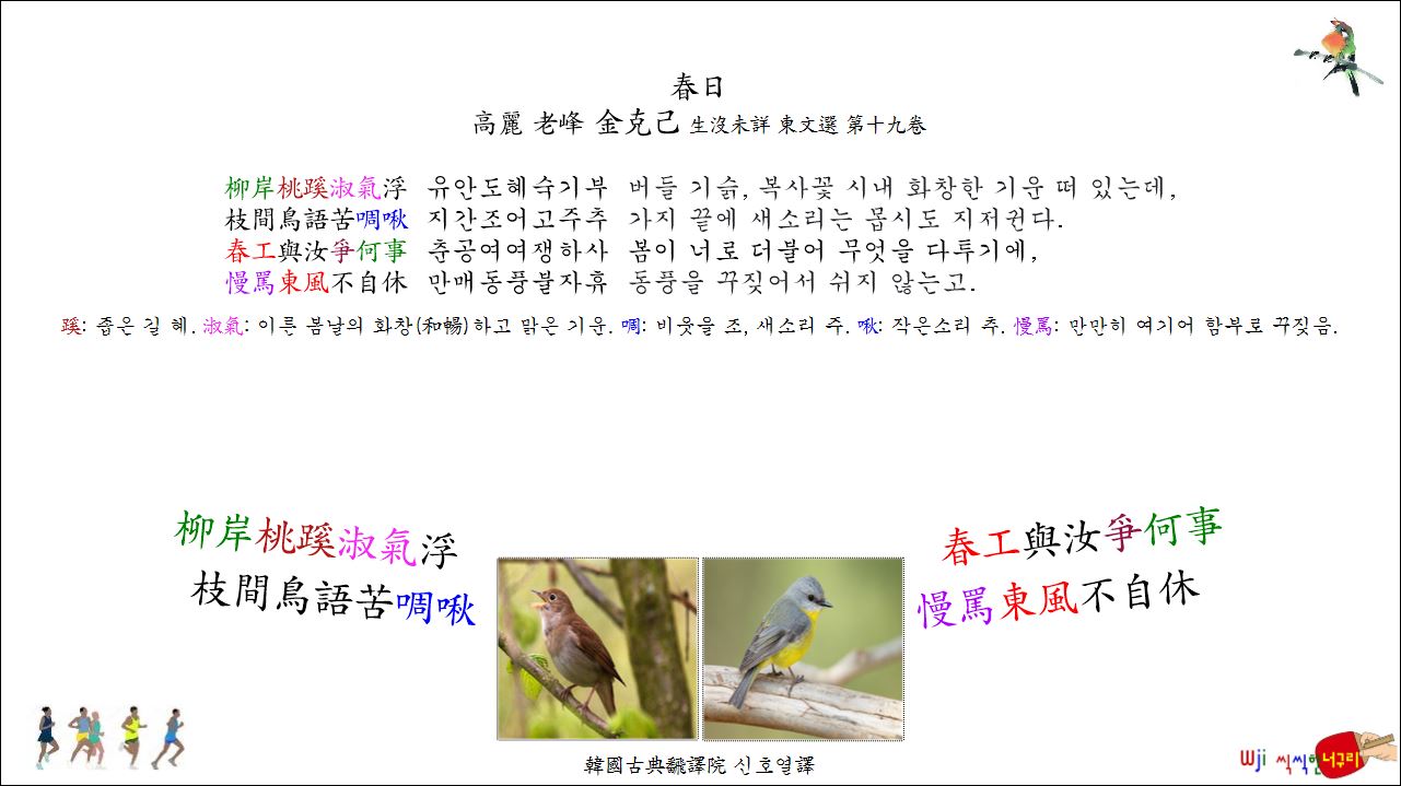 버들 기슭, 복사꽃 시내 화창한 기운 떠 있는데, 가지 끝에 새소리는 몹시도 지저귄다. 봄이 너로 더불어 무엇을 다투기에, 동풍을 꾸짖어서 쉬지 않는고.