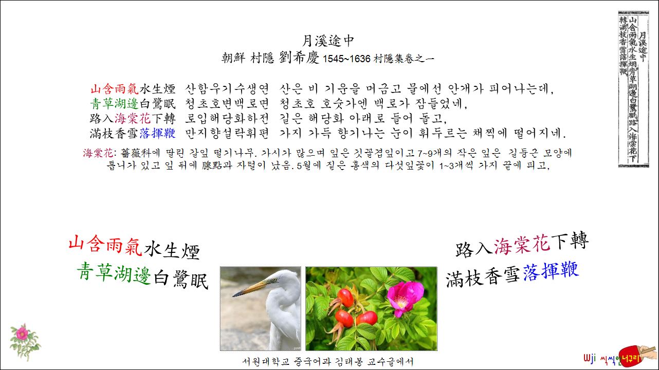 月溪途中 // 山含雨氣水生煙。靑草湖邊白鷺眠。路入海棠花下轉。滿枝香雪落揮鞭。봄 春 2026. 4. 5. 16:12