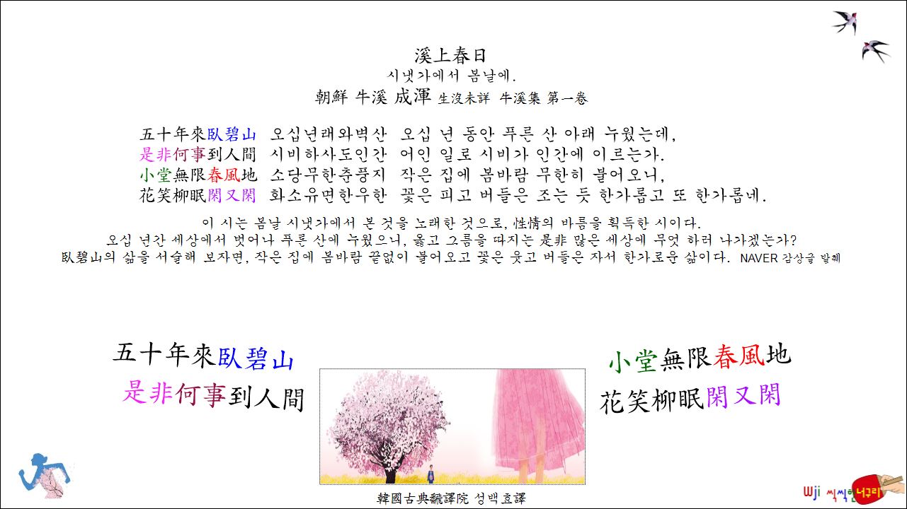 溪上春日 시냇가에서 봄날에. // 五十年來臥碧山。是非何事到人間。小堂無限春風地。花笑柳眠閑又閑。봄 春 2026. 4. 6. 19:54
