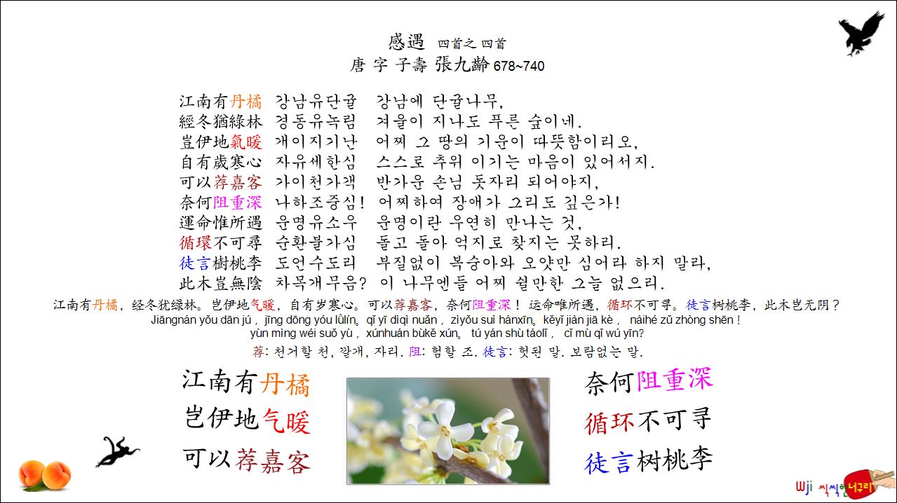 강남에 단귤나무, 겨울이 지나도 푸른 숲이네. 어찌 그 땅의 기운이 따뜻함이리오, 스스로 추위 이기는 마음이 있어서지. 반가운 손님 돗자리 되어야지, 어찌하여 장애가 그리도 깊은가! 운명이란 우연히 만나는 것, 돌고 돌아 억지로 찾지는 못하리. 부질없이 복숭아와 오얏만 심어라 하지 말라, 이 나무엔들 어찌 쉴만한 그늘 없으리.